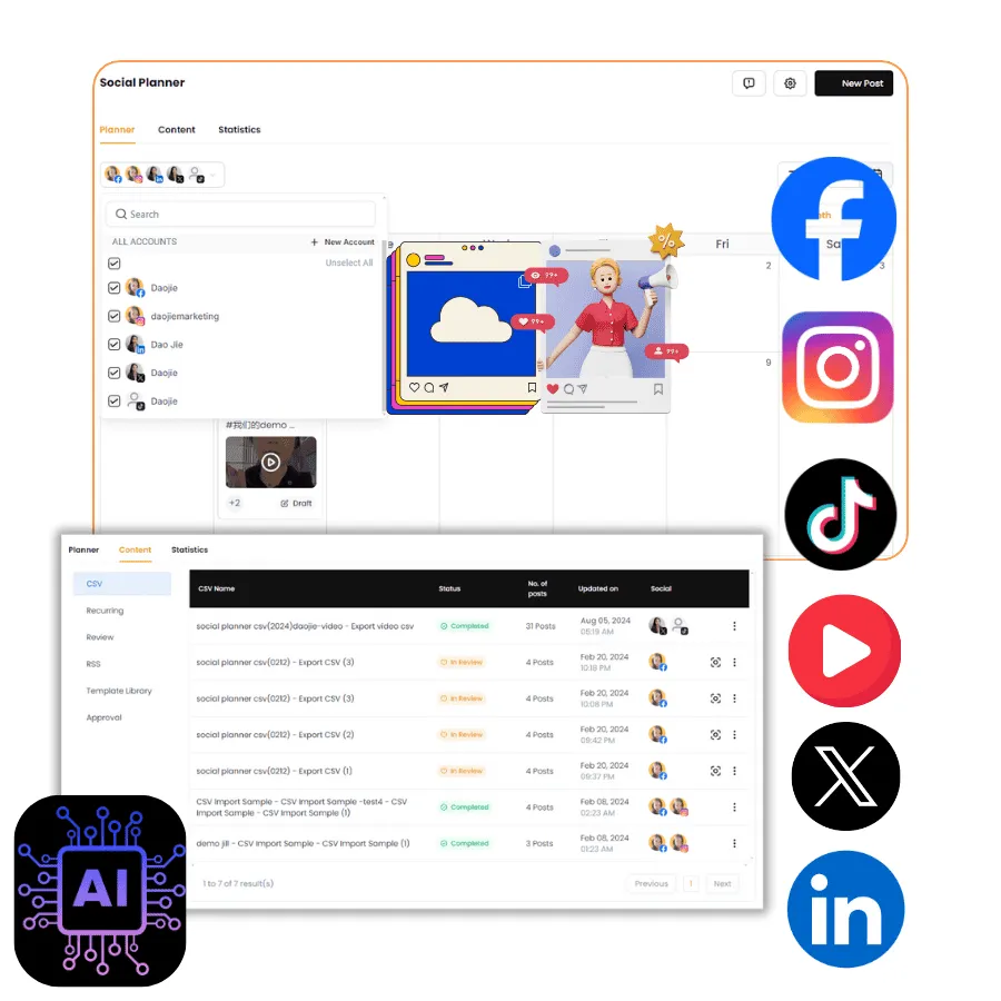 目前支持平台:Facebook、Instagram、TikTok、Twitter (X)、LinkedIn、YouTube、Youtube Shorts